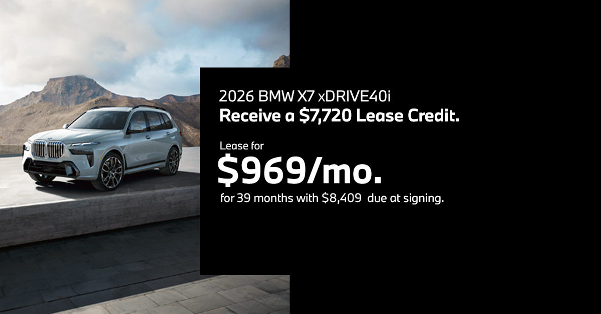 5 Payment does not include tax, license, or registration. $2,000 Loyalty Offers available to qualified customers who lease or finance through BMW Financial Services NA, LLC. Offer limited to customers who have owned or leased a BMW model in the last 12 months. In order to qualify for a BMW Loyalty Offer, loyal current or former BMW owners or lessees must show proof of ownership or BMW Financial Services account number and qualify for credit approval. Available Loyalty Offer of $2,000 off MSRP on select new 2026 X7 xDrive40i models. Must take delivery by December 01, 2025. Availability of Loyalty Offers are subject to dealer participation. Visit your authorized BMW Center for important details. Lease payment is calculated based on Manufacturer’s Suggested Retail Price for vehicle as shown and does not necessarily represent the dealer’s actual sale price. Dealer sets actual price. Lease offer available on new 2026 BMW X7 xDrive40i models from participating BMW Centers through BMW Financial Services NA, LLC, to customers who meet BMW Financial Services' credit requirements. Offer not valid in Puerto Rico. Monthly lease payments of $969 per month for 39 months is based on an adjusted capitalized cost of $79,790 (MSRP of $92,025, including destination and handling fee of $1,175, less $6,515 capitalized cost reduction, $0 security deposit, suggested dealer contribution of $3,720 and Lease Credit of $2,000). Actual MSRP and dealer contribution may vary and could affect your monthly lease payment. Cash due at signing includes $6,515 capitalized cost reduction, $969 first month's payment, $925 acquisition fee and $0 security deposit. Lessee responsible for insurance during the lease term, excess wear and tear as defined in the lease contract, $0.30/mile over 32,500 miles, plus disposition fee of up to $495 (not to exceed an amount permissible by law) at lease end. Not all customers will qualify for security deposit waiver. Tax, title, license, registration and dealer fees are additional fees due at signing. Advertised monthly payment does not include applicable taxes. Purchase option price at lease end is $48,773, plus the purchase option fee disclosed in the lease contract. Additional tax, title, and government fees may also apply. Offer valid through December 01, 2025 and may be combined with other offers unless otherwise stated. Models pictured may be shown with metallic paint and/or additional accessories. Visit your authorized BMW Center for important details.