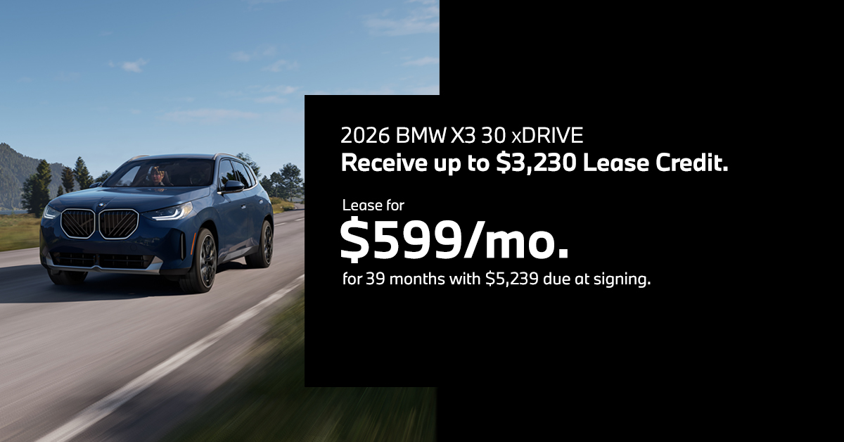 3 Payment does not include tax, license, or registration. $1,000 Loyalty Offers available to qualified customers who lease or finance through BMW Financial Services NA, LLC. Offer limited to customers who have owned or leased a BMW model in the last 12 months. In order to qualify for a BMW Loyalty Offer, loyal current or former BMW owners or lessees must show proof of ownership or BMW Financial Services account number and qualify for credit approval. Available Loyalty Offer of $1,000 off MSRP on select new 2026 X3 30 xDrive models. Must take delivery by February 02,2026. Availability of Loyalty Offers are subject to dealer participation. Visit your authorized BMW Center for important details. Lease payment is calculated based on Manufacturer’s Suggested Retail Price for vehicle as shown and does not necessarily represent the dealer’s actual sale price. Dealer sets actual price. Lease offer available on new 2026 BMW X3 30 xDrive models from participating BMW Centers through BMW Financial Services NA, LLC, to customers who meet BMW Financial Services' credit requirements. Offer not valid in Puerto Rico. Monthly lease payments of $599 per month for 39 months is based on an adjusted capitalized cost of $49,355 (MSRP of $55,300, including destination and handling fee of $1,350, less $3,715 capitalized cost reduction, $0 security deposit, and suggested dealer contribution of $2,230). Actual MSRP and dealer contribution may vary and could affect your monthly lease payment. Cash due at signing includes $3,715 capitalized cost reduction, $599 first month's payment, $925 acquisition fee and $0 security deposit. Lessee responsible for insurance during the lease term, excess wear and tear as defined in the lease contract, $0.25/mile over 32,500 miles, plus disposition fee of up to $495 (not to exceed an amount permissible by law) at lease end. Not all customers will qualify for security deposit waiver. Tax, title, license, registration and dealer fees are additional fees due at signing. Advertised monthly payment does not include applicable taxes. Purchase option price at lease end is $31,521, plus the purchase option fee disclosed in the lease contract. Additional tax, title, and government fees may also apply. Offer valid through February 02, 2026 and may be combined with other offers unless otherwise stated. Models pictured may be shown with metallic paint and/or additional accessories. Visit your authorized BMW Center for important details.