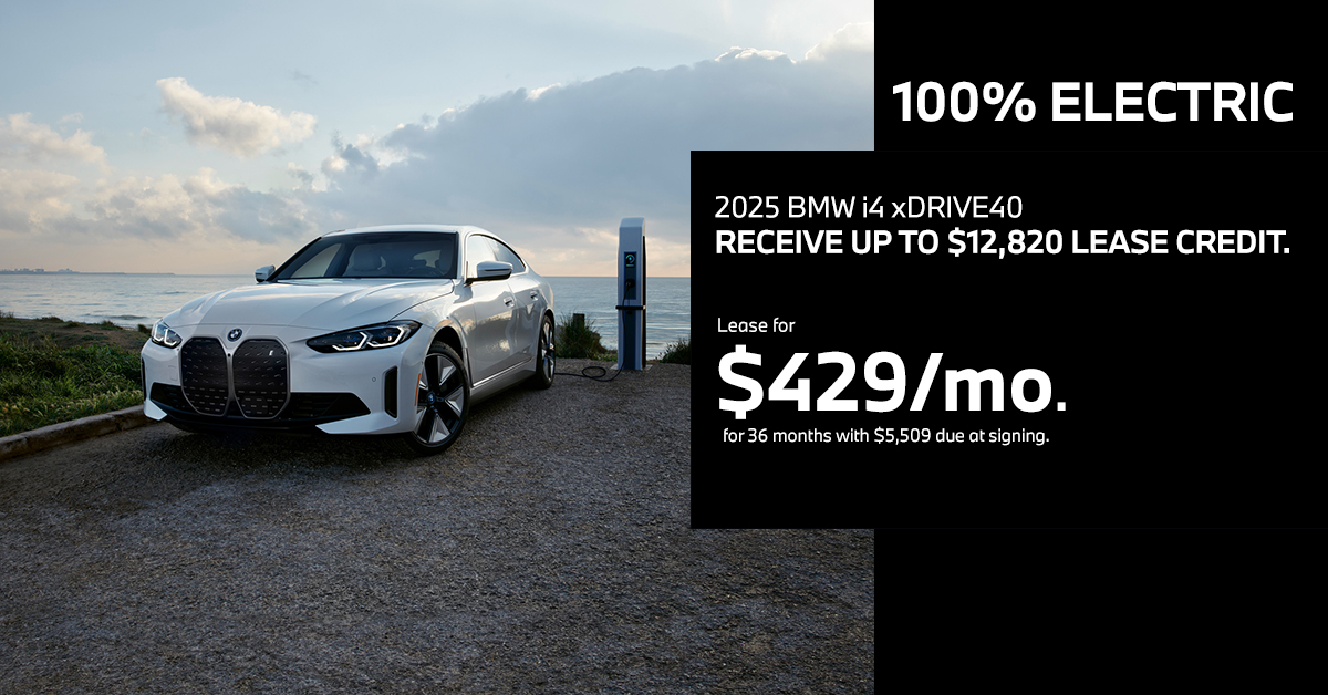 2 Payment does not include tax, license, or registration. $2,000 Loyalty Offers available to qualified customers who lease or finance through BMW Financial Services NA, LLC. Offer limited to customers who have owned or leased a BMW model in the last 12 months. In order to qualify for a BMW Loyalty Offer, loyal current or former BMW owners or lessees must show proof of ownership or BMW Financial Services account number and qualify for credit approval. Available Loyalty Offer of $2,000 off MSRP on select new 2025 i4 xDrive40 models. Must take delivery by December 01,2025. Availability of Loyalty Offers are subject to dealer participation. Visit your authorized BMW Center for important details. Lease payment is calculated based on Manufacturer’s Suggested Retail Price for vehicle as shown and does not necessarily represent the dealer’s actual sale price. Dealer sets actual price. Lease offer available on new 2025 BMW i4 xDrive40 models from participating BMW Centers through BMW Financial Services NA, LLC, to customers who meet BMW Financial Services' credit requirements. Offer not valid in Puerto Rico. Monthly lease payments of $429 per month for 36 months is based on an adjusted capitalized cost of $49,850 (MSRP of $64,825, including destination and handling fee of $1,175, less $4,155 capitalized cost reduction, $0 security deposit, suggested dealer contribution of $3,320 and Lease Credit of $7,500). Actual MSRP and dealer contribution may vary and could affect your monthly lease payment. Cash due at signing includes $4,155 capitalized cost reduction, $429 first month's payment, $925 acquisition fee and $0 security deposit. Lessee responsible for insurance during the lease term, excess wear and tear as defined in the lease contract, $0.25/mile over 30,000 miles, plus disposition fee of up to $495 (not to exceed an amount permissible by law) at lease end. Not all customers will qualify for security deposit waiver. Tax, title, license, registration and dealer fees are additional fees due at signing. Advertised monthly payment does not include applicable taxes. Purchase option price at lease end is $35,006, plus the purchase option fee disclosed in the lease contract. Additional tax, title, and government fees may also apply. Offer valid through December 01, 2025 and may be combined with other offers unless otherwise stated. Models pictured may be shown with metallic paint and/or additional accessories. Visit your authorized BMW Center for important details.