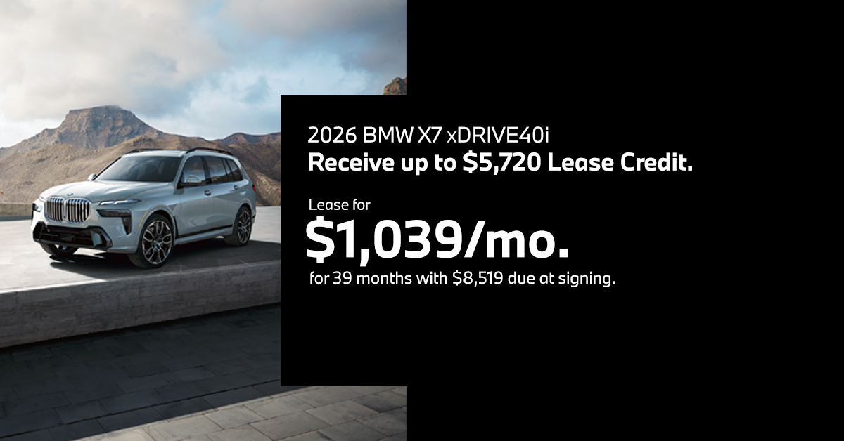 5 Payment does not include tax, license, or registration. $2,000 Loyalty Offers available to qualified customers who lease or finance through BMW Financial Services NA, LLC. Offer limited to customers who have owned or leased a BMW model in the last 12 months. In order to qualify for a BMW Loyalty Offer, loyal current or former BMW owners or lessees must show proof of ownership or BMW Financial Services account number and qualify for credit approval. Available Loyalty Offer of $2,000 off MSRP on select new 2026 X7 xDrive40i models. Must take delivery by February 02,2026. Availability of Loyalty Offers are subject to dealer participation. Visit your authorized BMW Center for important details. Lease payment is calculated based on Manufacturer’s Suggested Retail Price for vehicle as shown and does not necessarily represent the dealer’s actual sale price. Dealer sets actual price. Lease offer available on new 2026 BMW X7 xDrive40i models from participating BMW Centers through BMW Financial Services NA, LLC, to customers who meet BMW Financial Services' credit requirements. Offer not valid in Puerto Rico. Monthly lease payments of $1,039 per month for 39 months is based on an adjusted capitalized cost of $82,925 (MSRP of $93,200, including destination and handling fee of $1,550, less $6,555 capitalized cost reduction, $0 security deposit, and suggested dealer contribution of $3,720). Actual MSRP and dealer contribution may vary and could affect your monthly lease payment. Cash due at signing includes $6,555 capitalized cost reduction, $1,039 first month's payment, $925 acquisition fee and $0 security deposit. Lessee responsible for insurance during the lease term, excess wear and tear as defined in the lease contract, $0.30/mile over 32,500 miles, plus disposition fee of up to $495 (not to exceed an amount permissible by law) at lease end. Not all customers will qualify for security deposit waiver. Tax, title, license, registration and dealer fees are additional fees due at signing. Advertised monthly payment does not include applicable taxes. Purchase option price at lease end is $49,396, plus the purchase option fee disclosed in the lease contract. Additional tax, title, and government fees may also apply. Offer valid through February 02, 2026 and may be combined with other offers unless otherwise stated. Models pictured may be shown with metallic paint and/or additional accessories. Visit your authorized BMW Center for important details.
