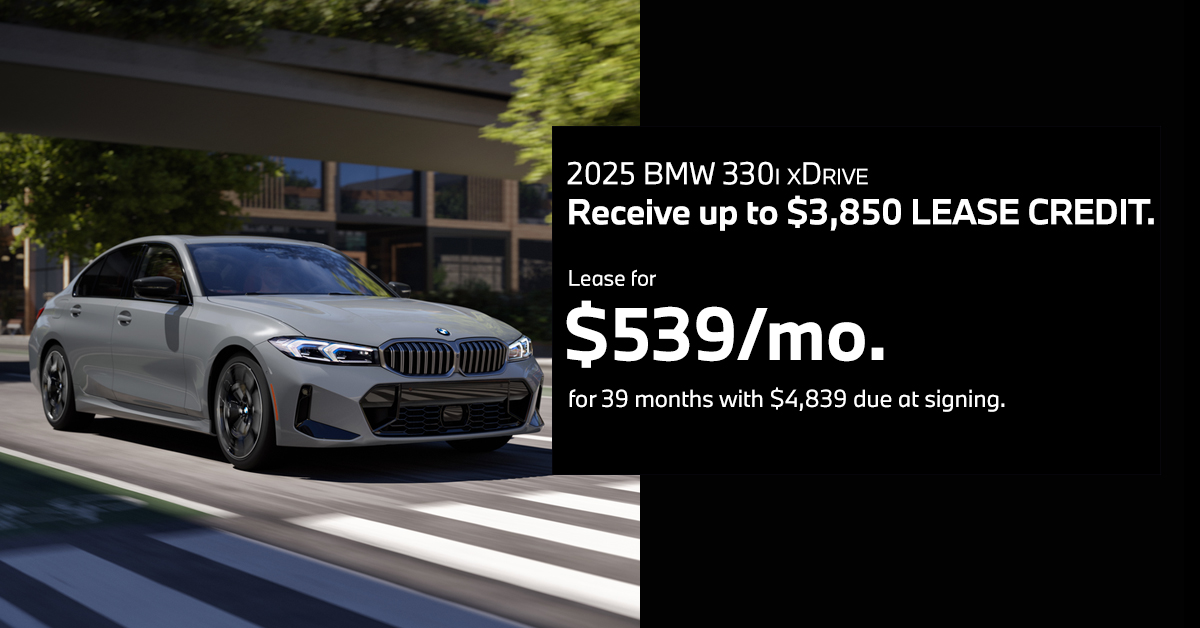 1 Payment does not include tax, license, or registration. $1,000 Loyalty Offers available to qualified customers who lease or finance through BMW Financial Services NA, LLC. Offer limited to customers who have owned or leased a BMW model in the last 12 months. In order to qualify for a BMW Loyalty Offer, loyal current or former BMW owners or lessees must show proof of ownership or BMW Financial Services account number and qualify for credit approval. Available Loyalty Offer of $1,000 off MSRP on select new 2026 330i xDrive Sedan models. Must take delivery by February 02,2026. Availability of Loyalty Offers are subject to dealer participation. Visit your authorized BMW Center for important details. Lease payment is calculated based on Manufacturer’s Suggested Retail Price for vehicle as shown and does not necessarily represent the dealer’s actual sale price. Dealer sets actual price. Lease offer available on new 2026 BMW 330i xDrive Sedan models from participating BMW Centers through BMW Financial Services NA, LLC, to customers who meet BMW Financial Services' credit requirements. Offer not valid in Puerto Rico. Monthly lease payments of $539 per month for 39 months is based on an adjusted capitalized cost of $49,425 (MSRP of $55,650, including destination and handling fee of $1,350, less $3,375 capitalized cost reduction, $0 security deposit, and suggested dealer contribution of $2,850). Actual MSRP and dealer contribution may vary and could affect your monthly lease payment. Cash due at signing includes $3,375 capitalized cost reduction, $539 first month's payment, $925 acquisition fee and $0 security deposit. Lessee responsible for insurance during the lease term, excess wear and tear as defined in the lease contract, $0.25/mile over 32,500 miles, plus disposition fee of up to $495 (not to exceed an amount permissible by law) at lease end. Not all customers will qualify for security deposit waiver. Tax, title, license, registration and dealer fees are additional fees due at signing. Advertised monthly payment does not include applicable taxes. Purchase option price at lease end is $31,721, plus the purchase option fee disclosed in the lease contract. Additional tax, title, and government fees may also apply. Offer valid through February 02, 2026 and may be combined with other offers unless otherwise stated. Models pictured may be shown with metallic paint and/or additional accessories. Visit your authorized BMW Center for important details.