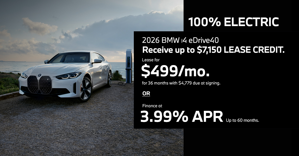 *Lease Disclaimer - Payment does not include tax, license, or registration. $1,000 Loyalty Offer available to qualified customers who have leased or financed a BMW model through BMW Financial Services NA, LLC in the last 12 months. In order to qualify for a BMW Loyalty Offer, loyal current or former BMW owners or lessees must show proof of ownership or BMW Financial Services account number and qualify for credit approval. Available Loyalty Offer of $1,000 off MSRP on select new 2026 i4 eDrive40 models (consists of $500 BMW of North America, LLC contribution plus $500 loyalty contribution from your BMW Center). Must take delivery by April 30, 2026. Availability of Loyalty Offers are subject to dealer participation. Visit your authorized BMW Center for important details. Lease payment is calculated based on Manufacturer’s Suggested Retail Price for vehicle as shown and does not necessarily represent the dealer’s actual sale price. Dealer sets actual price. Lease offer available on new 2026 BMW i4 eDrive40 models from participating BMW Centers through BMW Financial Services NA, LLC, to customers who meet BMW Financial Services' credit requirements. Offer not valid in Puerto Rico. Monthly lease payments of $499 per month for 36 months is based on an adjusted capitalized cost of $50,295 (MSRP of $60,700, including destination and handling fee of $1,350, less $3,355 capitalized cost reduction, $0 security deposit, suggested dealer contribution of $3,300 and Lease Credit of $3,750). Actual MSRP and dealer contribution may vary and could affect your monthly lease payment. Cash due at signing includes $3,355 capitalized cost reduction, $499 first month's payment, $925 acquisition fee and $0 security deposit. Lessee responsible for insurance during the lease term, excess wear and tear as defined in the lease contract, $0.25/mile over 30,000 miles, plus disposition fee of up to $495 (not to exceed an amount permissible by law) at lease end. Not all customers will qualify for security deposit waiver. Tax, title, license, registration and dealer fees are additional fees due at signing. Advertised monthly payment does not include applicable taxes. Purchase option price at lease end is $33,385, plus the purchase option fee disclosed in the lease contract. Additional tax, title, and government fees may also apply. Offer valid through April 30, 2026 and may be combined with other offers unless otherwise stated. Models pictured may be shown with metallic paint and/or additional accessories. Visit your authorized BMW Center for important details.